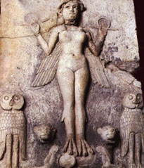 Sur cette photo d’une sculpture assyrienne représentation de Lilith, remarquer les chouettes symbole de la nuit et les ailes dans le dos (tout sauf celles d’un ange ;)). Pffouh je n’ai pas mis cette photo en une car elle me fout les chocottes :)).