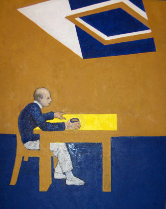 La maladie d’Alzheimer touche la mémoire et tout d’abord la mémoire des souvenirs récents alors que la mémoire des souvenirs plus anciens est tout d’abord sauvegardée. Cette maladie est terrible car elle touche à ce qu’il y a de plus intime en nous, au sentiment d’identité, d’être à la vie. Je vous présente une peinture d’Uthermolen, qui a peint cette toile alors qu’il vient d’apprendre qu’il est touché par cette maladie. Ensuite il fera des autoportraits de lui tout au long de l’évolution de la maladie.